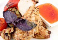 340/2 г • Куриное филе жареное на гриле с печеными овощами гриль и сладким соусом «Чили»