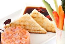 100/80/20/2 г • Тар-тар из лосося и морепродуктов, брусочки свежих овощей с чесночным соусом, хрустящие пшеничные гренки, соевый соус, имбирь маринованный