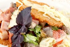 290/2 г • Листья салата, соус «Кассандра», куриное филе, бекон жареный, помидоры свежие, шампиньоны маринованные, оладьи картофельные, базилик свежий